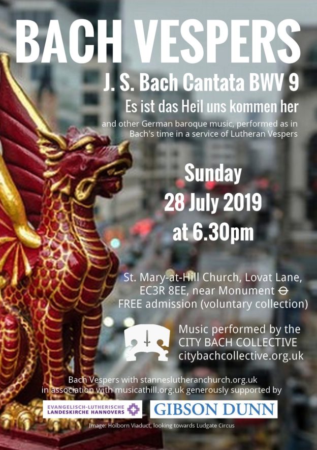 A performance of J. S Bach cantata BWV 9, Es ist das Heil uns kommen her along with other German Baroque music on period instruments, in a service of Lutheran Vespers. The service forms the final part of the month-long 24th St. Anne’s International Bach Festival, hosted by the music society Music -at-Hill. Visit musicathill.org.uk for more details of their events – including the Gala Concerto Concert at which we are also performing, two days prior to this service.